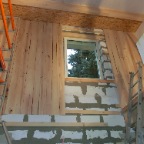 Die Erfahrungen aus den letzten Monaten haben uns gelehrt, dass es nahezu kein Gewerk gibt, auf welches wir uns verlassen konnten. Oft mussten wir uns nicht nur aufregen, sondern etwas nachbessern oder gar neu machen. Vieles hätte nicht funktioniert oder wäre optisch anders geworden, wenn wir nicht permanent kontrolliert und optimiert hätten. Bereits beim testweisen anbringen einiger Holzlatten haben wir festgestellt, dass unseren Ansprüchen in der Verkleidung der Wände wahrscheinlich keiner gerecht werden kann. Die Freude mit dem Holz zu arbeiten, das genießen des tollen Holzgeruches und das Erlebnis mit den eigenen Händen etwas Schönes zu schaffen, hat uns darüber hinaus zu der Entscheidung gebracht den bereits beauftragten Tischlern wieder abzusagen und selbst Hand an zu legen. So machten wir uns mit neuem Werkzeug an die Arbeit. Bereits nach zwei Tagen ließ sich mit viele Liebe zum Detail, splittrigen Händen und einer eingespielten und gut funktionierenden Aufgabenverteilung das erste Ergebnis sehen und genießen lassen.