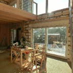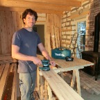 Langsam nehmen die Wände Gestalt an. Akribisch suchen wir die Anordnung der in der Musterung und Farbgebung doch sehr unterschiedlichen Holzlatten zusammen. Es kostet viel Zeit diese anschließend zurecht zu sägen und Unebenheiten und Krümmungen des sehr harten und schweren Holzes auszugleichen. Die winterliche Atmosphäre, der Kamin und die warme Ausstrahlung der bereits mit Holz verkleideten Wände sorgen dafür, dass wir trotz langer und arbeitsintensiver Nächte viel Gemütlichkeit empfinden.